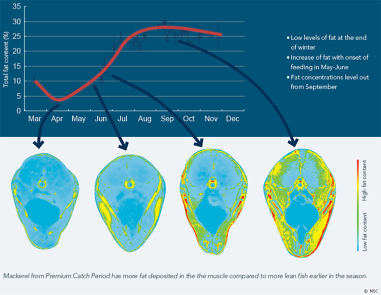 大西洋サバは、主にノルウェーなど北大西洋で漁獲されるサバの総称で、日本で流通しているマサバやゴマサバに比べて脂のりが良いのが特長です。4~7月にかけて餌を食べ脂質を蓄積し、8~11月にかけて脂質が最大約25%に、12月以降になると白子や卵が大きくなり脂質も減少します。本商品は、脂のりがピークの8~11月に買い付けた限定品となっています。